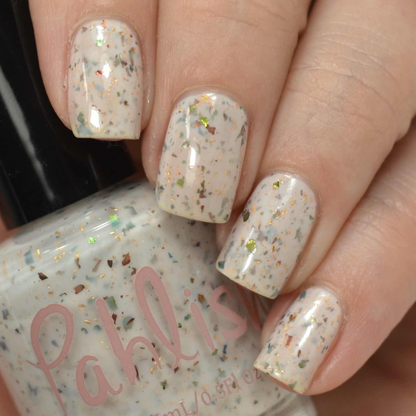 Odette is a delicate porcelain blue cream with crushed gold flakes. This polish will be free with all $50+ orders and will not be available for purchase as it is exclusive to this event. This polish applied wonderfully and evenly and is soooo beautiful! I adore all of the gold flake polishes that Pahlish creates, they’re one of my favorite finishes. My swatches show 2 coats plus a quick drying top coat.